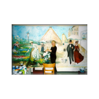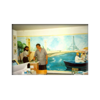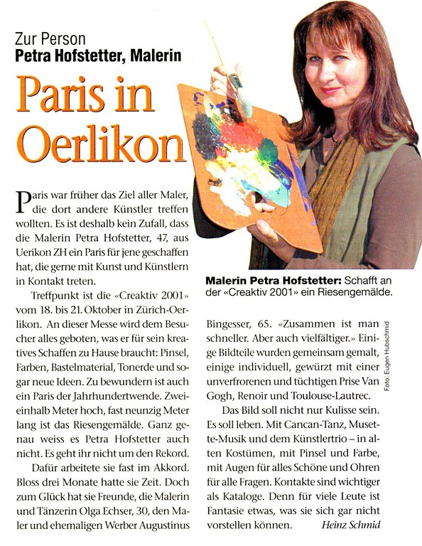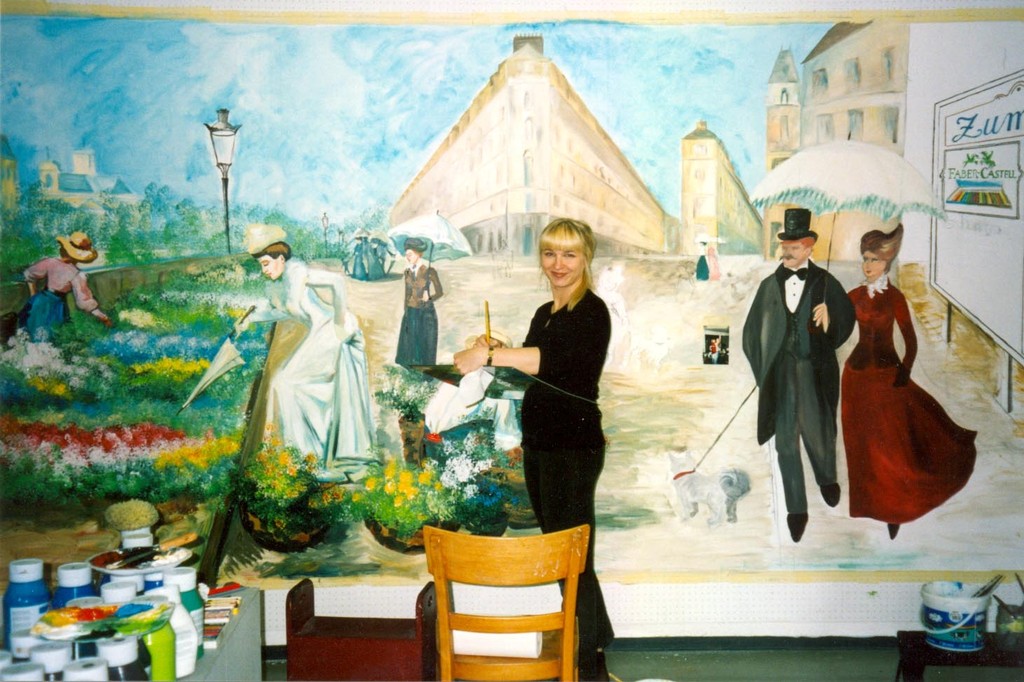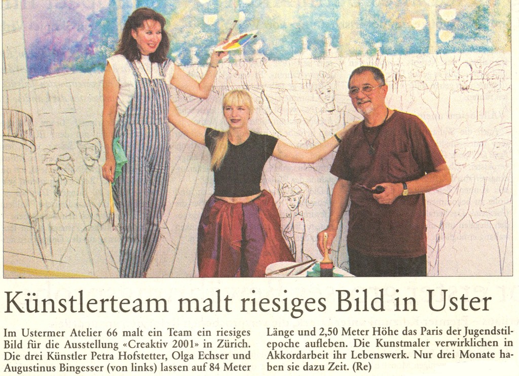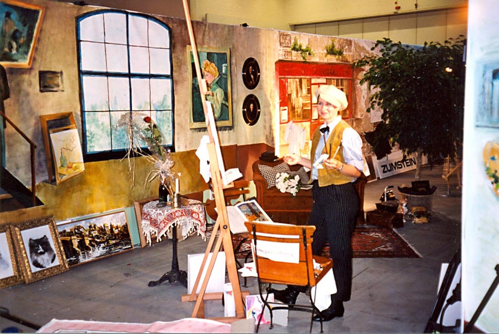 Riesenbild für die Creaktiv-Messen in den Züspa-Hallen für die Firmen Talens, Faber Castell, BAM und Zumstein. Entstanden in Zusammenarbeit mit den befreundeten Künstlern Olger Echser und Augustinus Bingesser. Das beinahe 100m lange Bild, unter dem Motto "Paris 1900" , diente an mehreren Creaktiv-Messen als Stimmungsträger für Verkaufsstände, Bistro, Maldemonstrationen und Showeinlagen.