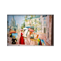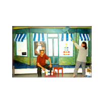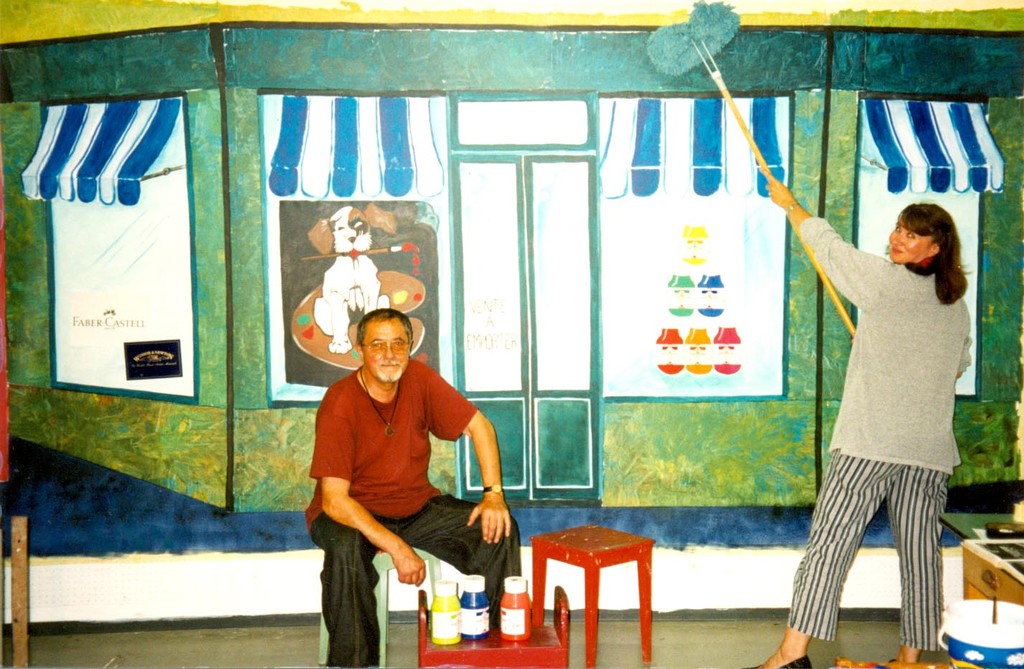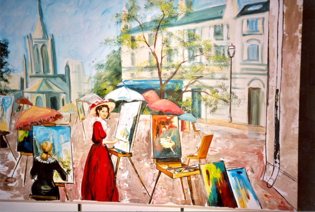 Riesenbild für die Creaktiv-Messen in den Züspa-Hallen für die Firmen Talens, Faber Castell, BAM und Zumstein. Entstanden in Zusammenarbeit mit den befreundeten Künstlern Olger Echser und Augustinus Bingesser. Das beinahe 100m lange Bild, unter dem Motto "Paris 1900" , diente an mehreren Creaktiv-Messen als Stimmungsträger für Verkaufsstände, Bistro, Maldemonstrationen und Showeinlagen.
